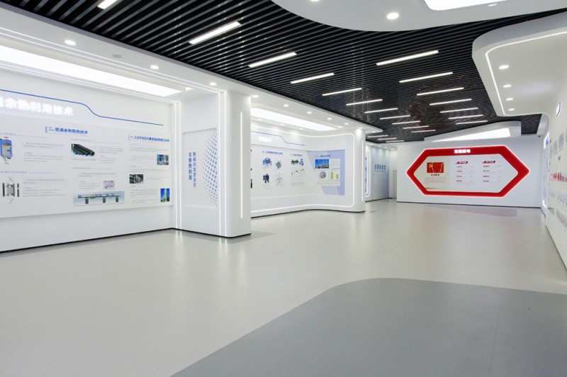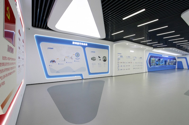 頂和地面造型統(tǒng)一,白色吊頂和灰色橡膠地面,黑色方鋼吊頂和灰色橡膠地面相互呼應(yīng),統(tǒng)一中富有變化,變化中又蘊(yùn)含統(tǒng)一,使整個(gè)展廳科技意境深遠(yuǎn)悠長(zhǎng)。
